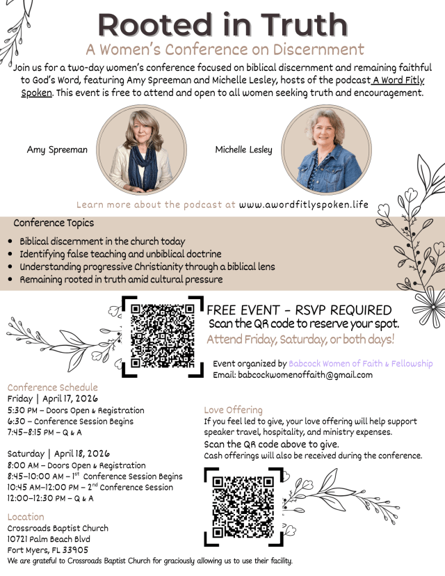 “Barbara and Jean, when we talked about Priscilla Shirer and Bethel, I was so concerned for you both that I sinfully failed to exercise self control. I spoke to you very rudely and unkindly, and that was wrong. I apologize and ask your forgiveness. If you would ever like any information about Priscilla Shirer and Bethel, please don’t hesitate to let me know, but even if not, I hope we can still be friends.”