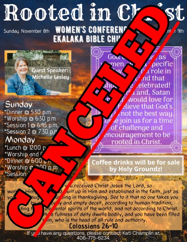 Ladies- If you were planning to attend next week’s conference at Ekalaka Bible Church, I’m sorry to tell you I was just informed today that EBC is canceling the conference due to illness.