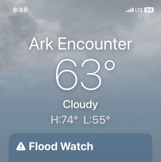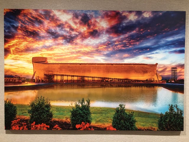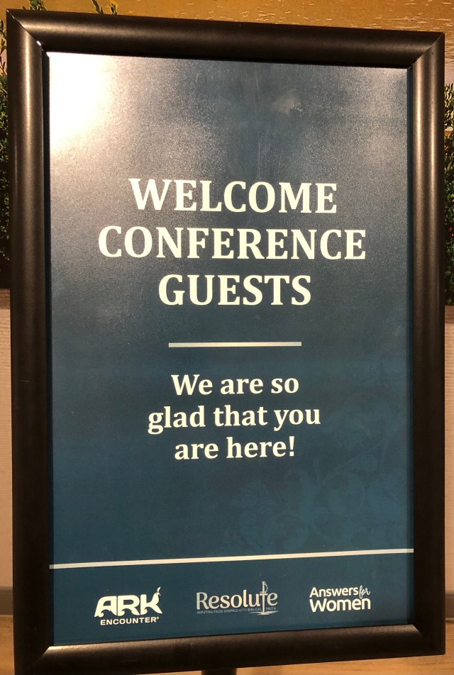 When my husband and I arrived Sunday night at our hotel, it was dark, raining, we were under a flood watch, and the doors of the Ark were already shut. But we weren’t worried because we’re cessationists and we’re not in the New Apostolic Reformation, so we knew this wasn’t a sign from God, just His humorous Providence.๐